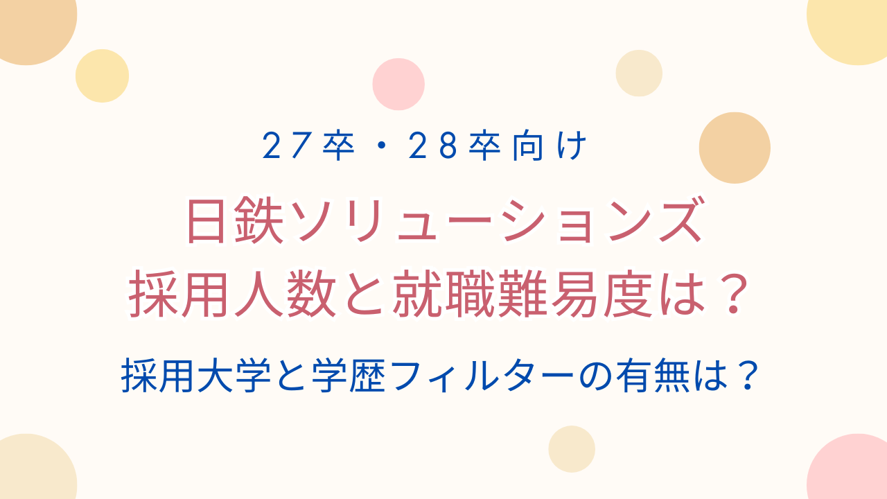 27卒・28卒で日鉄ソリューションズを志望する就活生に向けて、日鉄ソリューションズの採用人数の規模感、就職難易度の実態、採用大学の傾向、学歴フィルターの有無について網羅的に解説します。SIerとしての位置付けや選考で評価されるポイントまで詳しく整理します。