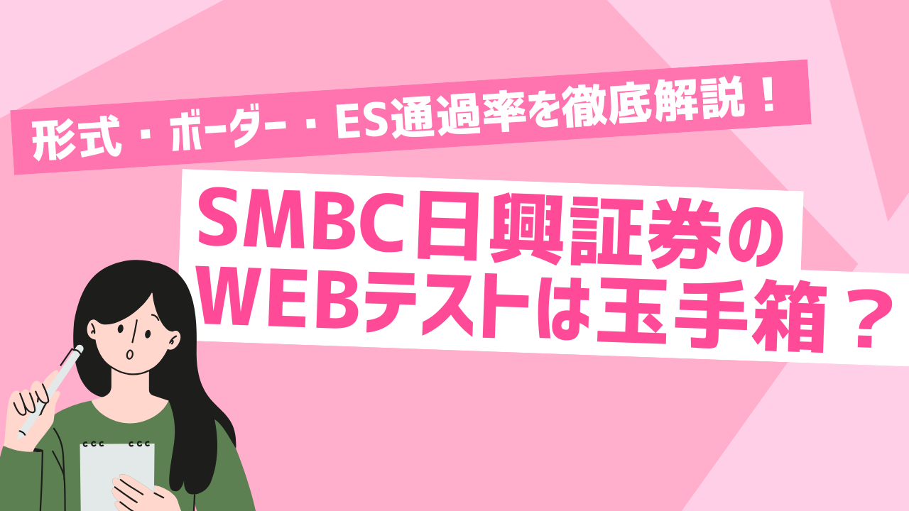 SMBC日興証券の選考では、エントリー初期にWEBテストが課され、その結果が書類選考の合否を左右します。テスト形式は玉手箱なのか、出題内容やボーダー、ES通過率はどの程度なのか気になる方も多いでしょう。本記事では、各種就活サイトの情報をもとに、SMBC日興証券のWEBテストの実態と対策ポイントを分かりやすく解説します。