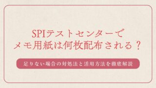 就職活動の適性検査であるSPIの「テストセンター方式」を受験する際、メモ用紙が何枚もらえるか、足りなかった場合どうすればいいかといった疑問を持つ人は多いです。とくに非言語(数学系)の問題では計算や図表の整理が不可欠であり、与えられるメモ用紙...